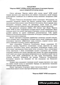 Олтиариқлик ишчилар норозилигига изоҳ сифатида тақдим қилинган ҳужжатда:
