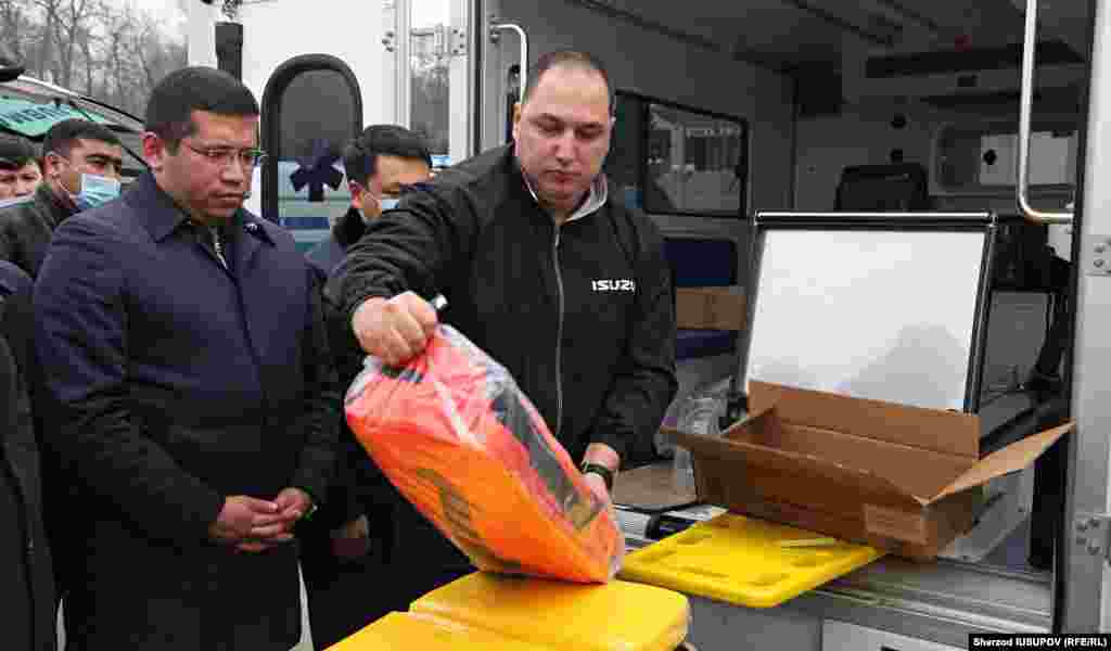 Тез ёрдам автомашиналарини Ўш шаҳри марказий майдонида Қирғизистон расмийларига Ўзбекистон номидан Андижон вилояти хокими ўринбосари Ботир Хамроев топширди.