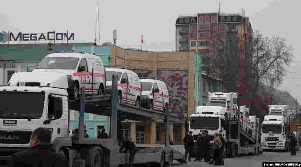 Ўзбекистон Қирғизистонга совға қилган 20 та тез ёрдам машинаси Ўш шаҳрига олиб келинди