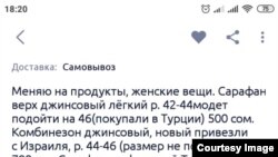 Ольга кийим-кечакларини озиқ-овқатга алмаштириш тўғрисида эълон берган ягона бишкеклик эмас. Қирғизистоннинг эълон ва рекламага ихтисослашган оммавий Lalafo порталида бу каби эълонларни ўнлаб ўқиш мумкин.
