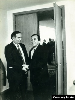 Ислом Каримов илк бор президент этиб сайланган кун журналист Исмат Хушев уни табрикламоқда.(Исмат Хушев архивидан олинди).