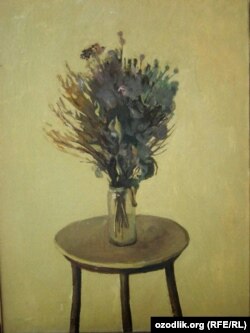 “Қуриган гуллар” 1986 йил. Мато, мойбўëқ. Бу асар илк марта 1988 йилда Тошкентдаги Илҳом кўргазмалар залида намойиш қилинган. Бу расм ҳам Москвадаги Суриков институти бадиий устахонасида таниқли рассом Тоҳир Салахов раҳбарлигида яратилган.