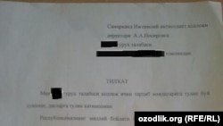 Пахта терими аввалида шу коллеж ўқувчилари раҳбарият уларни пахта теримига мажбурловчи тилхат ёздираётганини хабар қилган ва тилхат нусхасини Озодликка йўллаган эди.