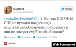 «Тома (холаси Тамара Собировани назарда тутаяпти- таҳр.) бор-йўғини тўплаб, берди... одатдагидай, Акбар яширин равишда уй қамоғида сақланаяпти.. Биз ҳеч нарсага қарамасдан, унинг (Акбар) учун хурсандмиз», дея твитлади Гулнора.