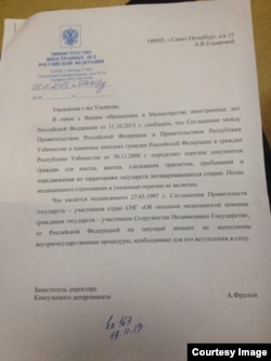 Вазирлик жавобида Россия Федерацияси ҳукумати ва Ўзбекистон ҳукумати ўртасида 2000 йил, 30 ноябрида фуқароларнинг ўзаро борди-келдилари тўғрисида келишув имзолангани, ҳужжатда ҳар иккала давлат фуқароларининг борди-келдиларини тартибга солувчи ҳужжатлар рўйхати берилгани, ўша рўйхатга тиббий суғурта полиси киритилмагани айтилган.
