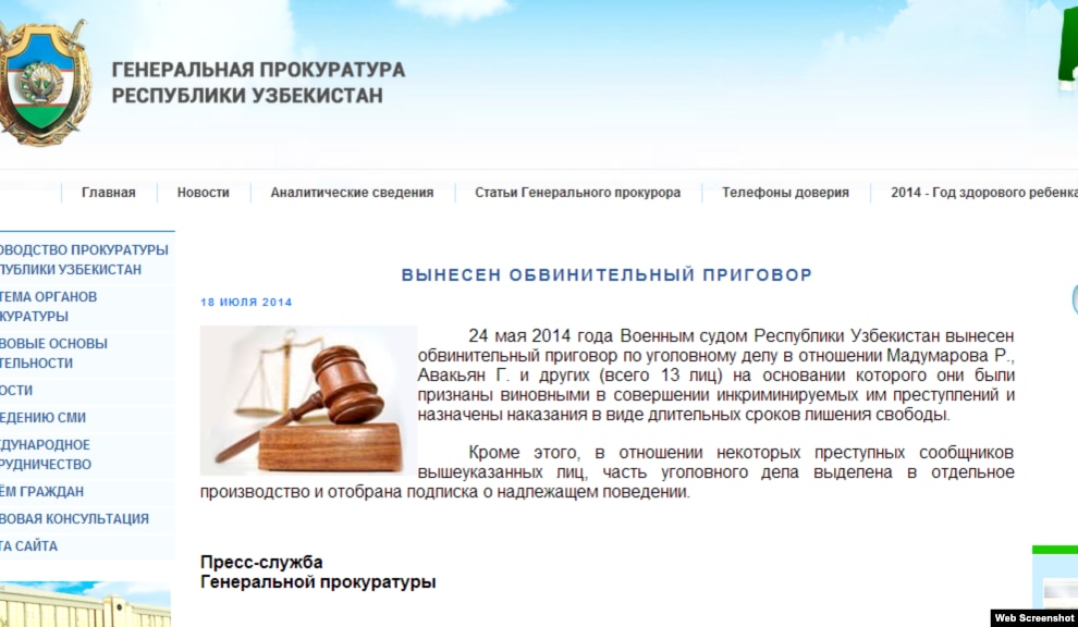 "Судланувчилар содир этган жиноятлари учун эълон қилинган айбловлар бўйича айбли деб топилиб, уларга узоқ муддатга озодликдан маҳрум қилиш тариқасидаги жазо тайинланган", дейилади Бош прокуратура хабарида.
