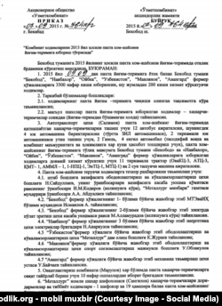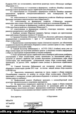 "Ўзметкомбинат" акциадорлик жамияти раҳбарияти томонидан имзолангани акс этган ҳужжат нусхаси Озодлик электрон почтасига келди.