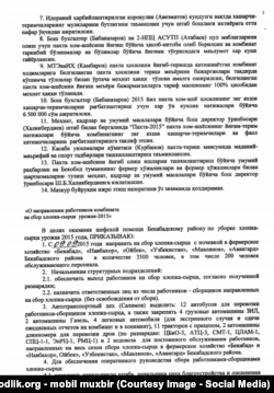 "Комбинат ходимларини 2015 йил ҳосили пахта хом-ашёсини йиғим-теримига юбориш тўғрисида" деб номланган буйруқда Бекобод туманига оталик ёрдамини кўрсатиш мақсадида завод ишчилари зиммасига вазифа юкланган.