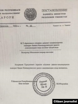 Айни пайтда Рустам Ориповни "Асака" банки бошқарувининг раиси лавозимидан озод қилиш тўғрисида Бош вазир Шавкат Мирзиёевнинг ҳали имзоланмаган 26-сонли буйруғининг нусхаси Озодликка етиб келди.