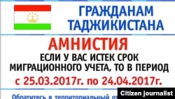 2017 йилнинг 25 мартидан шу йилнинг 24 апрелигача бир ой давом этадиган миграция амнистиясига мувофиқ тожикистонлик нолегал муҳожирлар депортация қилинмасдан ва мамлакатдан чиқмасдан легаллашиш ҳуқуқига эга бўлди.