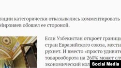 Аммо, икки давлат раҳбарлари Владимир Путин ва Шавкат Мирзиёевнинг 5 апрелдаги учрашувидан маълум бўлдики, иқтисодий алоқаларнинг қайта тикланишини Тошкент фақат ҳамкорлар олдидаги қатъий мажбуриятларсиз МДҲ доирасида кўрмоқда ва Евросиё иттифоқига қўшилишга шошилмаётир”, деб ёзди Газета.ру.
