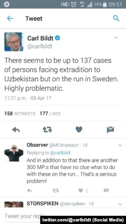 Айни пайтда Швеция собиқ бош вазири Карл Билдтга кўра, Швецияда Ўзбекистонга экстрадиция этилиши керак бўлган 137 шахс бор, аммо улар қочувдадир.
