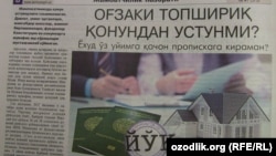 Ички ишлар вазирлигининг Миграция ва фуқароликни расмийлаштириш бош бошқармаси Тошкент вилояти бўлими бошлиғининг оғзаки топшириғи боис журналист Жамшид Ниёзовнинг қонуний ҳуқуқи бузилди (“Жамият”, 13 октябрь). Журналист Чирчиқ шаҳридан доимий пропискадан ўчган ва Қибрайдаги ўзи тегишли уйга пропискага кирмоқчи бўлган. Аммо Қибрай паспорт бўлинмаси раҳбари юқоридан доимий пропискани тўхтатиб туриш бўйича оғзаки топшириқ берилганини айтиб, журналистни доимий рўйхатга қўйишдан бош тортган. Қайд этилишича, доимий пропискани тўхтатиш ҳақидаги оғзаки буйруқ мамлакат парламенти қабул қилган қонунга зиддир.
