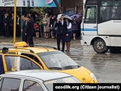 Озодликнинг Урганчдаги муштарийлари ёмғир остида президентларни кутаётган ўқувчилар ва ўқитувчиларнинг расмларини йўллади.
