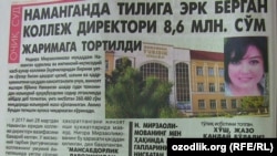 Наманган юридик коллежи директори Нодира Мирзаолимова ўқитувчи ва ўқувчиларни уятли сўзлар билан ҳақоратлагани учун судда жавоб берди. Бу ҳақда Олий суд матбуот хизмати маҳаллий нашрларга маълум қилган. Директор, шунингдек, ўқитувчиларни “порахўр” деб асоссиз айблаган, уларнинг миллатини юзига солиб, айирмачилик қилган. Жабрдийда ўқитувчиларнинг шикояти асосида директорга нисбатан Жиноят кодексининг 140-моддаси бўйича иш очилган. Судланувчи Н.Мирзаолимова маҳкама жараёнида айбини тан олмаган, аммо ҳужжат ва далиллар асосида айби тўлиқ исботланган. Тилига эрк берган директор бир йилга мансабдорлик ва моддий жавобгарлик ишларида фаолият юритиш ҳуқуқидан маҳрум этилган ва жаримага тортилган.