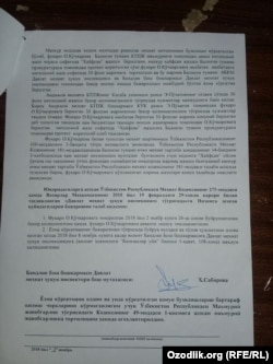 Унинг шикоят қилишича, вилоят Бандлик бош бошқармаси буни тан олган ва уни ишга қайта тиклаш ҳақида ёзма кўрсатма берган, аммо бу ва бошқа кўрсатмалар жамғарма раҳбарлари томонидан бефарқ қолдирилмоқда.