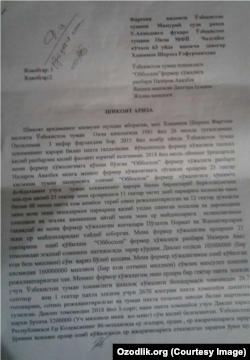 Озодликка Фарғона вилоятининг Ўзбекистон туманидан боғланган 38 яшар фермер Шерзод Ҳошимов ўзига қарашли 23 гектар ернинг ноқонуний равишда бошқа фермерга ўтказиб берилганини даъво қилди.