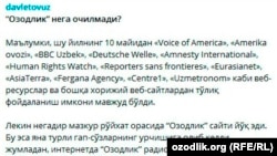 Айни пайтда Ўзбекистонда ozodlik.org сайтига тўғридан-тўғри кириш имконсиз бўлиб қолмоқда.