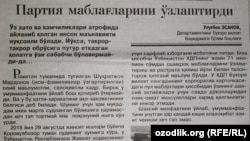 Ўзбекистон халқ-демократик партияси Бухоро вилоят кенгаши бош ҳисобчиси партия маблағларини талон-тарож этишда айбдор деб топилди (“Ҳуқуқ”, 23 май).