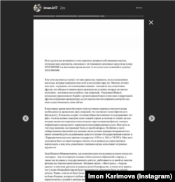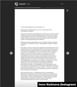 Қуйида Имон Каримованинг Instagram саҳифасида чоп этилган мактуб матни билан танишишингиз мумкин: