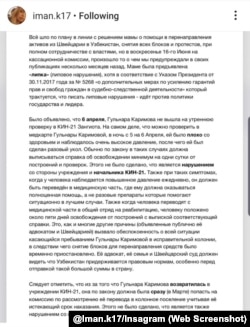 Онасининг оғир аҳволда эканини тасвирлаган Имон Каримова¸ Мирзиëевдан зудлик билан операцияга муҳтож онасини озодликка чиқаришни сўрайди.