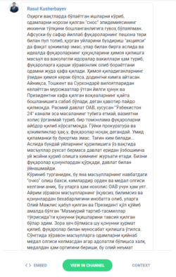 Депутат ўз Телеграм-каналида “айниқса, Тошкент ва Сурхондарё вилоятларидан келаётган мурожаатлар ўтган йилги хунук ва Президентни хафа қилган воқеаларнинг қайта бошланишига сабаб бўлади, деган хавотир пайдо қилмоқда”, деб ёзган.