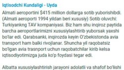 “Олмаота аэропортини $415 миллион долларга сотиб юборишибди (Олмаота аэропорти 1994 йилдан бери хусусий). Сотиб олувчи: Туркиянинг TAV Airports Holding компанияси. Биз ҳам шу инқироз пайтида барча аэропортларимизни хусусийлаштириб юборсак яхши бўлар эди... Шунча йил рақобатсиз бўлган авиатраснпорт учун рақобатчилар кириб келса, иқтисодиётимизга жуда кўп фойдаси тегар эди” деб ёзди иқтисодчи.