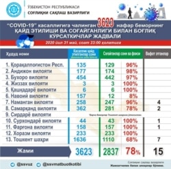 Соғлиқни сақлаш вазирлигининг билдиришича, 31 май соат 23:00 ҳолатига кўра,коронавирусга чалинганлар сони расман 3623 нафарга етди.
