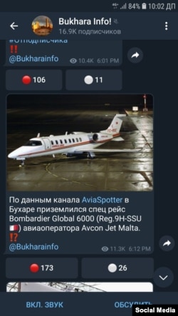 Бу раддия билан кетма-кет кечки 7:30 лар атрофида Телеграмдаги @aviaspotter канали Avcon Jet Malta авиаопраторига қарашли Bombardier Global 6000 (Reg.9H-SSU🇲🇹) русумидаги махсус самолëтнинг Тошкентдан Бухорога “Ўзбекистон Республикаси ҳукумати хизматини қилиш учун “ учиб келганини хабар қилди.