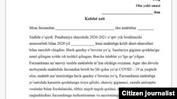 Бўстон туман СЭОМ врачининг айтишича, ўқитувчилар Covid-19 тестидан, Бош вазир Абдулла Ариповнинг топшириғига биноан, бутун мамлакат бўйича ўтказилмоқда. Бироқ жойларда, касалликдан сақланишнинг ғаройиб йўлларини ўйлаб топмоқдалар. Масалан, Намангандан хабар қилишларича, шаҳардаги мактабларда “фарзандим мактабда ковид юқтирса эътирозим йўқ” деган мазмунда кафолат хати олиняпти”. Бу ҳақда хабар қилган наманганлик тилхат намунасини ҳам Озодликка жўнатди.