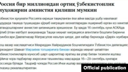 Ўзбекистон ҳукумати Россияга кириши тақиқланган ёки айни вақтда ушбу мамлакат ҳудудида тақиққа тушишидан қўрқиб миграция хизматларидан яшириниб юрган юз минглаб ватандошларнинг амнистия қилинишига эришмоқчи (www.daryo.uz, 16 сентябрь).