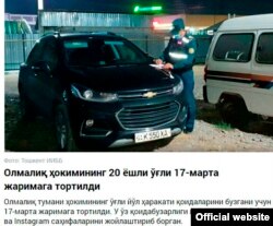 Тошкент вилояти Олмалиқ шаҳри ҳокимининг ўғли Дилшод Исмоилов йўл ҳаракати қоидаларини бузгани учун 17-марта жаримага тортилди (www.gazeta.uz, 1 октябрь).
