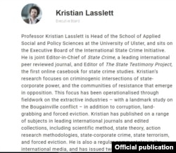 Британиядаги Ulster университетининг криминология бўйича профессори Кристиан Ласслетт Шавкат Мирзиëев эълон қилган ислоҳотлар амалда қандай кечаëтганига бағишланган қатор журналистик суриштирувлар муаллифи.