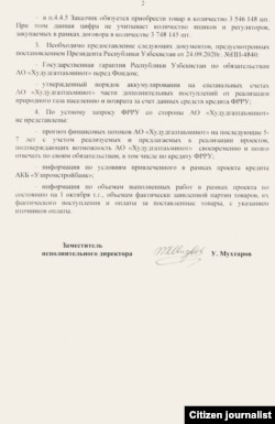 Иловаси билан бирга 15 саҳифалик бу шартномага Texnopark МЧЖ (етказиб берувчи-таҳр.) томонидан унинг директори Сарвар Аҳадов¸ “Ҳудудгазтаъминот” АЖ (буюртмачи-таҳр.) томонидан эса¸ АСКУГ (табиий газ назоратининг автоматлаштирилган ҳисобга олиш тизими-таҳр.) дирекцияси раҳбари Шаҳноза Исломова қўл қўйган.