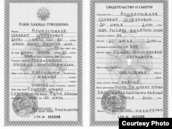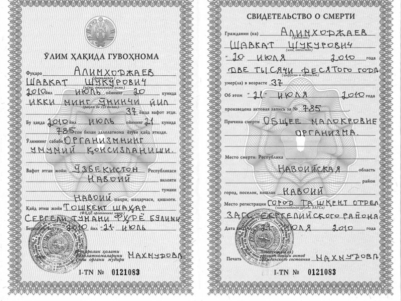 Қамоқхонада қийноқлардан ўлгани айтилаëтган Шавкат Алимхўжаев яқинларига берилган гувоҳнома.