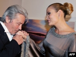 Alain Delon 2009 йилнинг 8 апрелида Парижда ўтказилган "Ўзбекистон - 2020' деб номланган хайрия кечасида Лола Каримованинг қўлини ўпмоқда.