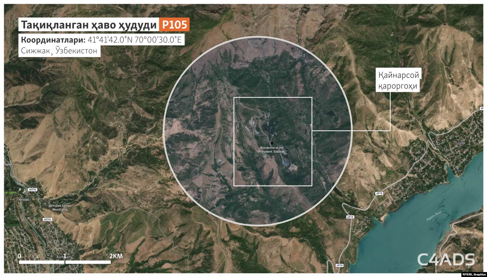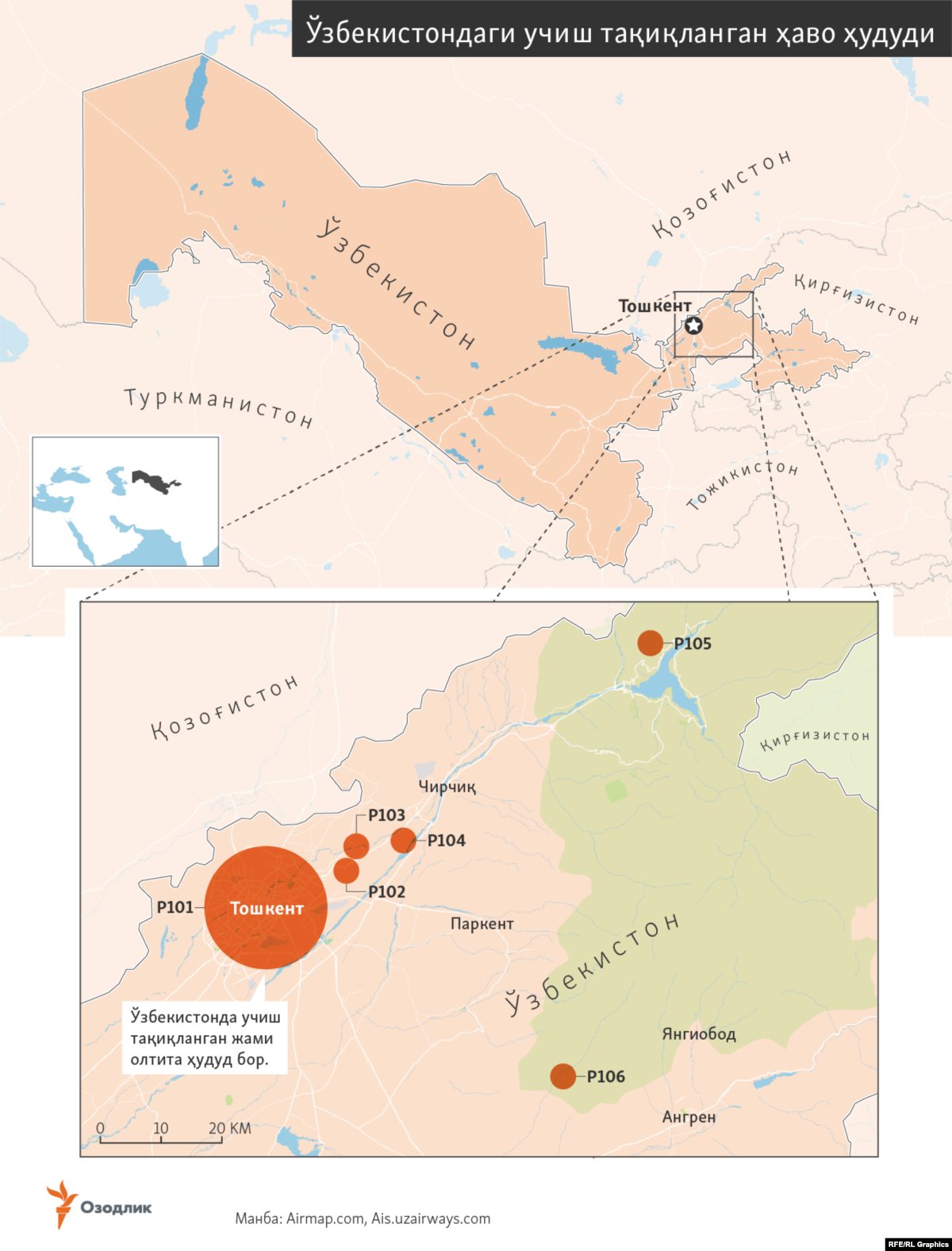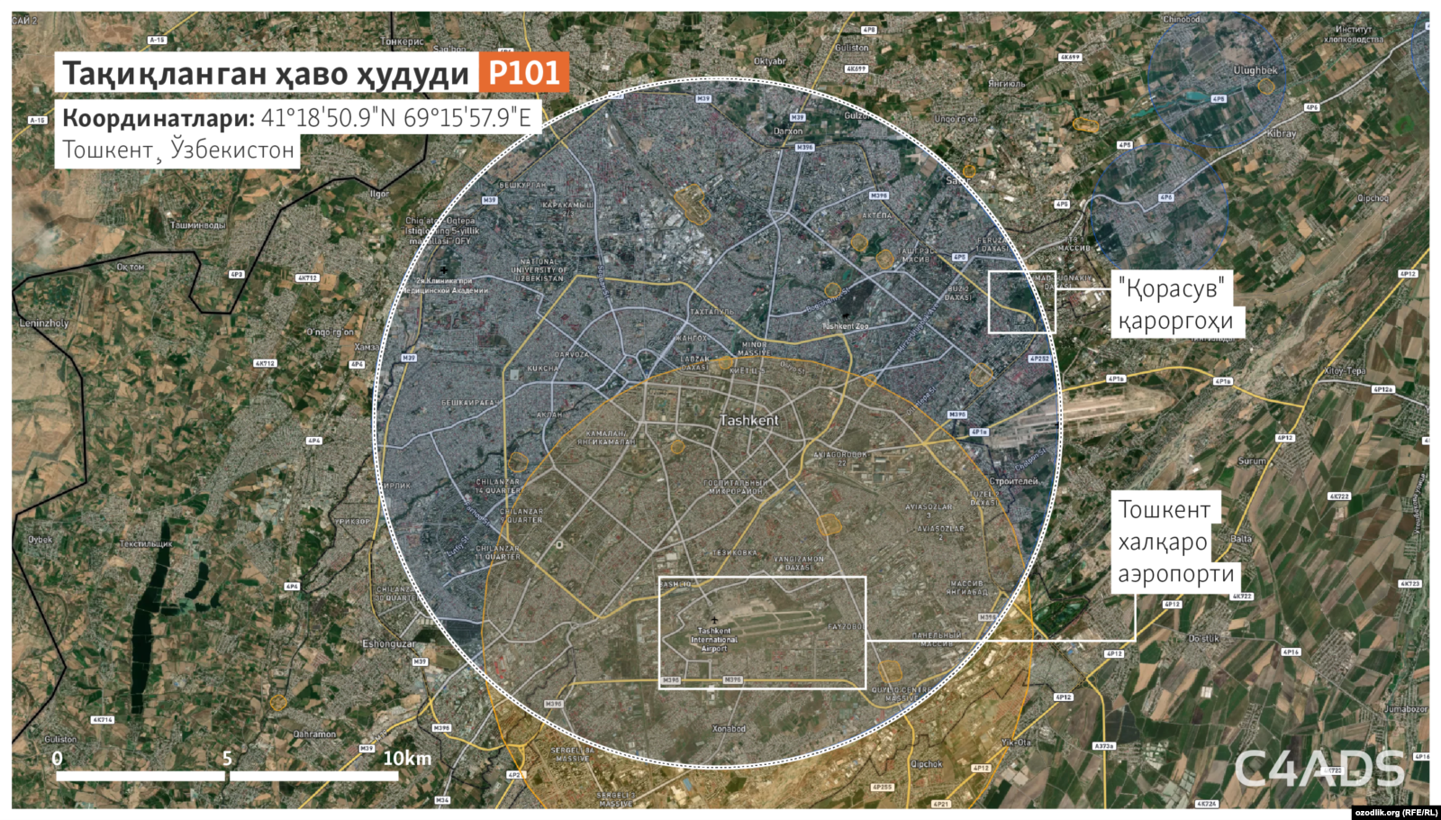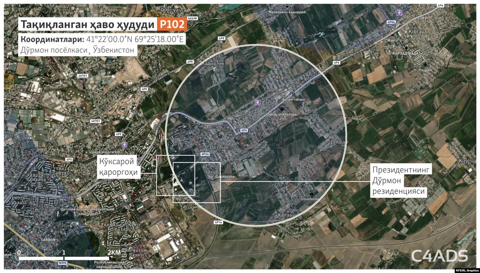 Ўзбекистон Республикаси Фуқаро авиацияси агентлигининг Озодлик боғланган мулозими лотин алифбосининг “P” ҳарфи билан таснифланган учиш тақиқланган зоналарда асосан президент резиденциялари жойлашганини тасдиқлади.