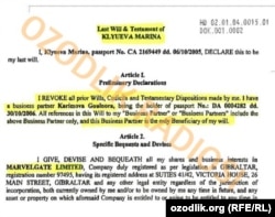 Авакян¸ Мадумаров ва Клюевалар¸ маҳкамада намойиш этилган ва нусхаси Озодликка берилган васиятномаларида¸ Takilant, Swisdorn ва Marvelgate ширкатларига оид барча бойликларнинг ягона ва сўнгги эгаси Гулнора Каримова экани ва ўзларидан кейин бу ширкатлар ва унга оид бойликларни Гулнора Каримовага васият қилиб қолдиришларини ëзади.