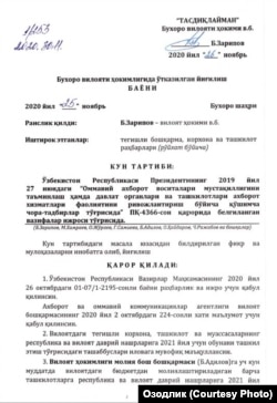 Озодликка нусхаси юборилган ҳужжатлардан яна бири Бухоро вилоят ҳокими лавозимини вақтинча бажараëтган Ботир Зарипов 25 ноябрь куни ўтказган мажлис қарорининг 26 ноябрь куни тасдиқланган “Баëни”дир.