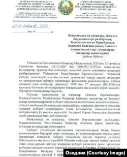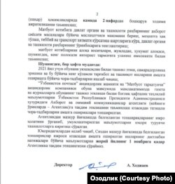 Озодликка нусхаси юборилган ҳужжатлардан бири Ўзбекистон Республикаси Президенти Администрацияси ҳузуридаги Ахборот ва оммавий коммуникациялар агентлиги директори Асаджон Ходжаевнинг 27 октябрь куни имзолаган хатидир.