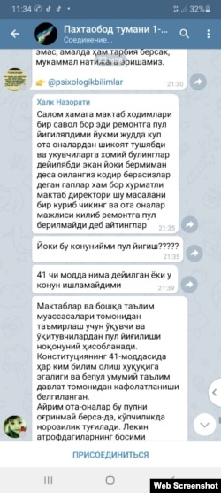 Paxtaobodlik ota-onalar maktab ta’miri uchun pul yig‘ish masalasi muhokama qilingan Telegramdagi yozishma nusxasini Ozodlikka yo‘llashdi.