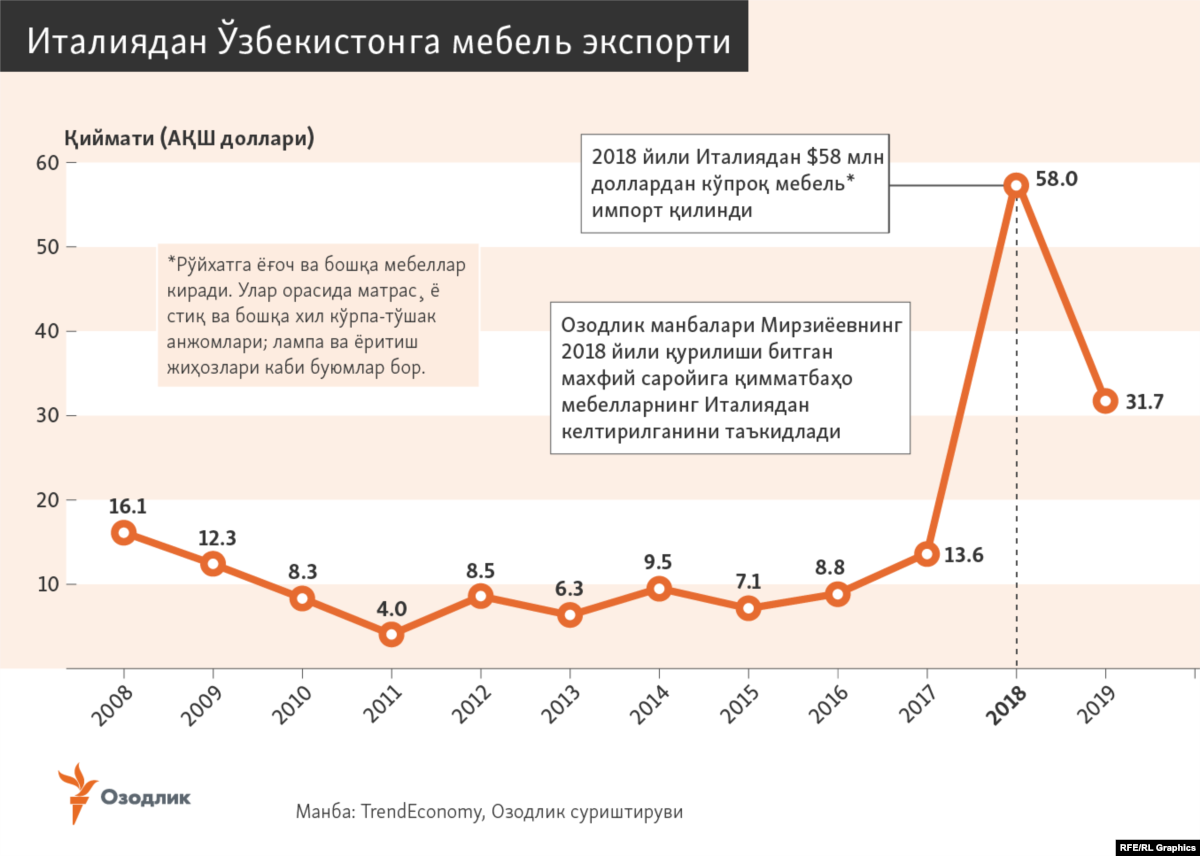 Шоввозсой мажмуасининг асосий бинолари қуриб битказилиб¸ жиҳозланган 2018 йилги Италиядан Ўзбекистонга импорт қилинган мебеллар қиймати¸ ўзаро савдо рақамларига қаралса¸ олдинги йилга нисбатан сезиларли даражада ошгани Озодлик манбалари берган маълумотни тасдиқлайди.