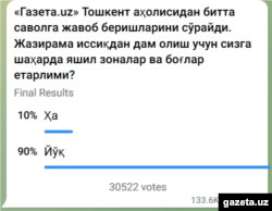 2021 йилнинг 3-7 кунлари Тошкентда ҳаво ҳароратининг мисли кўрилмаган 44 даражадан ошиб кетиши кузатилди. Газета.уз нашри июль ойида ўз Телеграм каналида ўтказган сўровда тошкентликларнинг 90 фоизи пойтахтда яшил ҳудуд ва боғлар етишмаслигини билдирган.