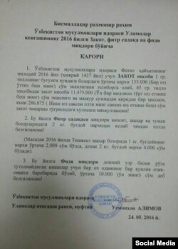 Рамазон ойи арафасида Ўзбекистон Мусулмонлари диний идораси раиси, муфтий Усмонхон Алимов 24 май куни имзолаган "2016 йилги Закот, фитр садақа ва фидя миқдори" бўйича қарор матни ҳали Вазирлар Маҳкамаси қошидаги Дин ишлари бўйича қўмита томонидан тасдиқланмай туриб, ижтимоий тармоқларда тарқалиб кетди.