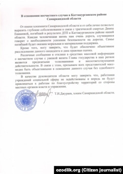 Мактубда айтилишича, Диана Еникееванинг фожеали ўлими бўйича Ўзбекистон ЖКнинг 266-моддаси, 2-қисми асосида 14 март куни қўзғатилган жиноят иши суриштируви тугаб, 29 март куни иш судга оширилган.