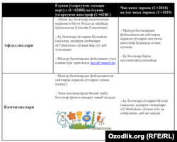 Янги ёзувда энг катта ноқулайликларни «ў» ва «ғ» ҳарфлари ҳамда тутуқ белгиси келтириб чиқаради. Ҳозирги кунда ушбу ҳарфларни ёзишда қабул қилинган белгилар ўрнига турли-туман белгилар ишлатилмоқда.