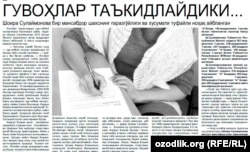 Тошкент вилояти Янгийўл ва Бўка туманлараро суд-тиббий экспертиза бўлинмалари мудири лавозимида фаолият юритган Шоира Сулаймонова 12 йилдан буён адолат учун курашмоқда (“Ўзбекистон овози”, 10 март). Гап шундаки, у 2010 йилда Жиноят кодексининг қатор моддаларида айбланиб, 6 йилга озодликдан маҳрум қилинган эди. 2008-2009 йиллар оралиғида Янгийўл шаҳри прокурорининг ўринбосари Фаррух Боқиев Ш.Сулаймонова ва у билан бирга ишлайдиган суд-тиббий экспертларга тазйиқ ўтказган. Оқибатда икки ўртада шахсий келишмовчилик келиб чиққан. Прокурорнинг собиқ ўринбосари ўзига бўйсунувчи ИИБ ходимларидан туҳматдан иборат кўрсатмалар ёздириб олган ва Ш.Сулаймоновага нисбатан асоссиз равишда жиноят иши очган. Аёл прокурорнинг шахсий адовати туфайли 3 йил “зона”да ўтириб чиққан. Собиқ мудира мансаб ваколатларини суиистеъмол қилиб, ўлим ҳолатлари бўйича нотўғри хулоса бериш ва пора талаб қилишда айбланган.