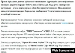 Танлов натижаларига кўра, “МТМ Таъминот” МЧЖ 2,5-3 метрлик кипарис дарахтининг ҳар бирини 270 минг сўмдан, жами 1640та кўчат харид қилиш учун шартнома тузилган. Шартнома қиймати – 442,8 млн сўм. Танловда, шунингдек, “Мунис Келажак Иқбол” ХК ва “Мега Барака Соф” МЧЖ ҳам ўз таклифи билан қатнашган. Маълум бўлишича, юқоридаги учала корхона ҳам бир кишига – Эгамбердиев Равшан Валиевичга тегишли.