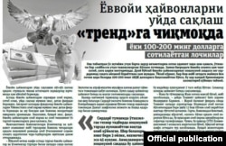 Ёввойи ҳайвонларни уйда сақлашни кўз-кўз қилиш орқали “тренд”га чиқиш истагидаги харидорлар кўпаймоқда (“Оила ва табиат” газетаси, 7 апрель).