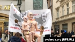 Прагадаги фаоллар акцияси: Қўғирчоқ Путин ва Лукашенко тилла тувакка ўтирғизилди